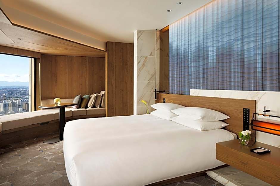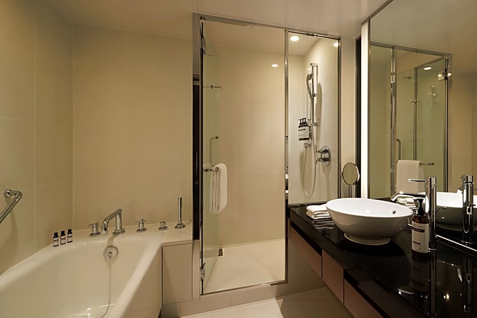 Luxurious room with private concierge service and Club Lounge access, including breakfast, tea service and evening cocktails. A glass wall separates it from the bathtub and walk-in shower. Amenities include bathrobes, a laptop safe and a music player connection to the flat-screen TV.